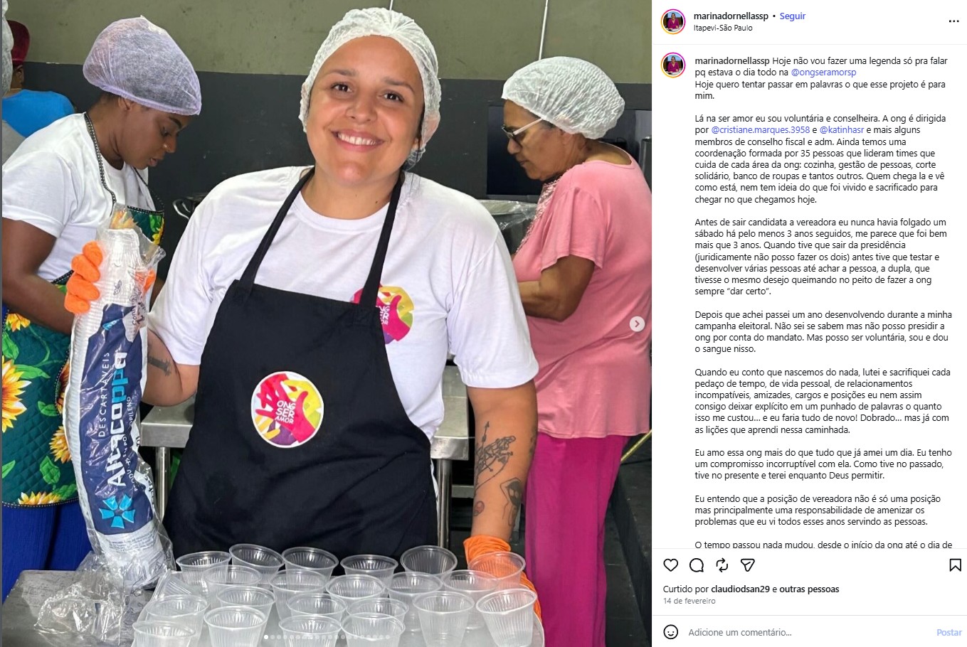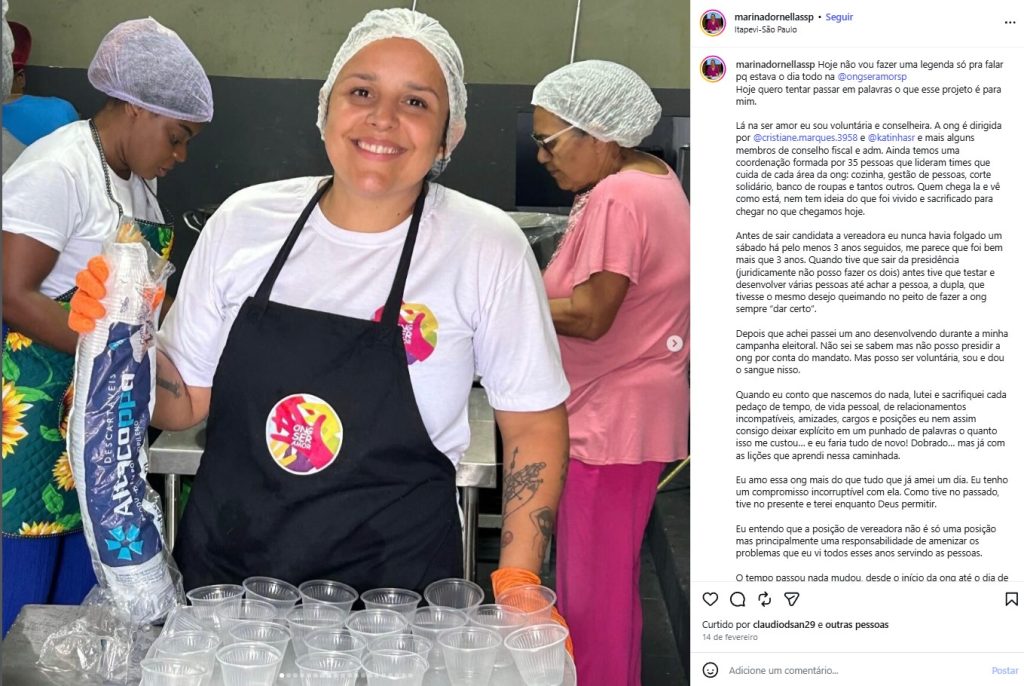 Outro elemento que chama atenção é o uso recorrente da camiseta da ONG “Ser Amor” em vídeos e ações públicas — inclusive nas iniciativas vinculadas à parceria com a Enel — reforçando visualmente sua associação com a entidade e potencializando sua identificação política com o projeto social.