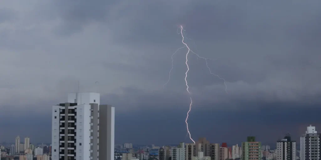 A Defesa Civil recomenda evitar áreas sujeitas a alagamentos e enxurradas, buscar abrigo seguro longe de árvores, postes e estruturas metálicas, e observar sinais de deslizamento em áreas de encosta. Em emergência, ligue para 199 (Defesa Civil) ou 193 (Corpo de Bombeiros).