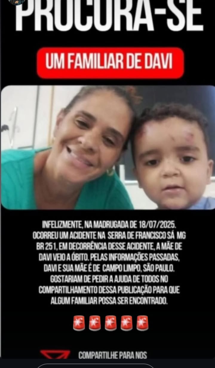 Na madrugada desta sexta-feira, um grave acidente ocorreu na Serra de Francisco de Sá , em Minas Gerais, envolvendo um carro no qual estavam uma mulher e seu filho, um menino pequeno identificado como Davi. Infelizmente, a mulher não resistiu aos ferimentos e veio a óbito no local.